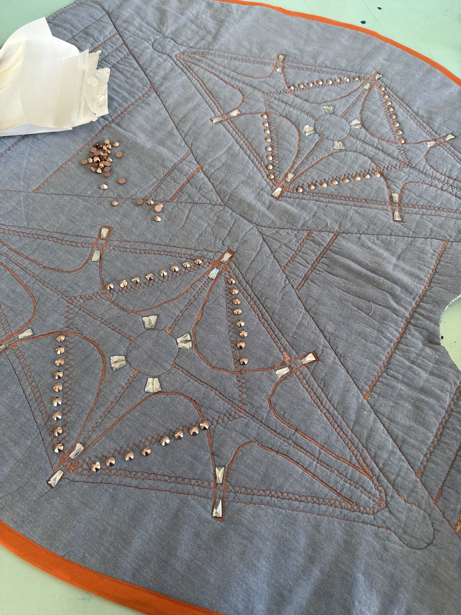 I partnered with fashion designer Chloe Corso on her collection Man and the Machine, which explored the evolving relationship between humans and technology. Chloe developed all motifs, color direction, and placement layouts for the garments, while my role focused on translating her digital concepts into tangible surface embellishment through machine stitching. I provided a comprehensive stitch library outlining the full capabilities of my equipment, and together we mapped out the specific stitch types and applications for each element of her designs. I executed all topical stitching according to this plan, ensuring technical precision and alignment with her creative vision. The completed textile work contributed to five final looks and an accompanying fashion film. This project reinforced my commitment to collaborative practice and the value of combining specialized skills to bring complex concepts to life. More of Chloe’s work can be found on her website and Insta!