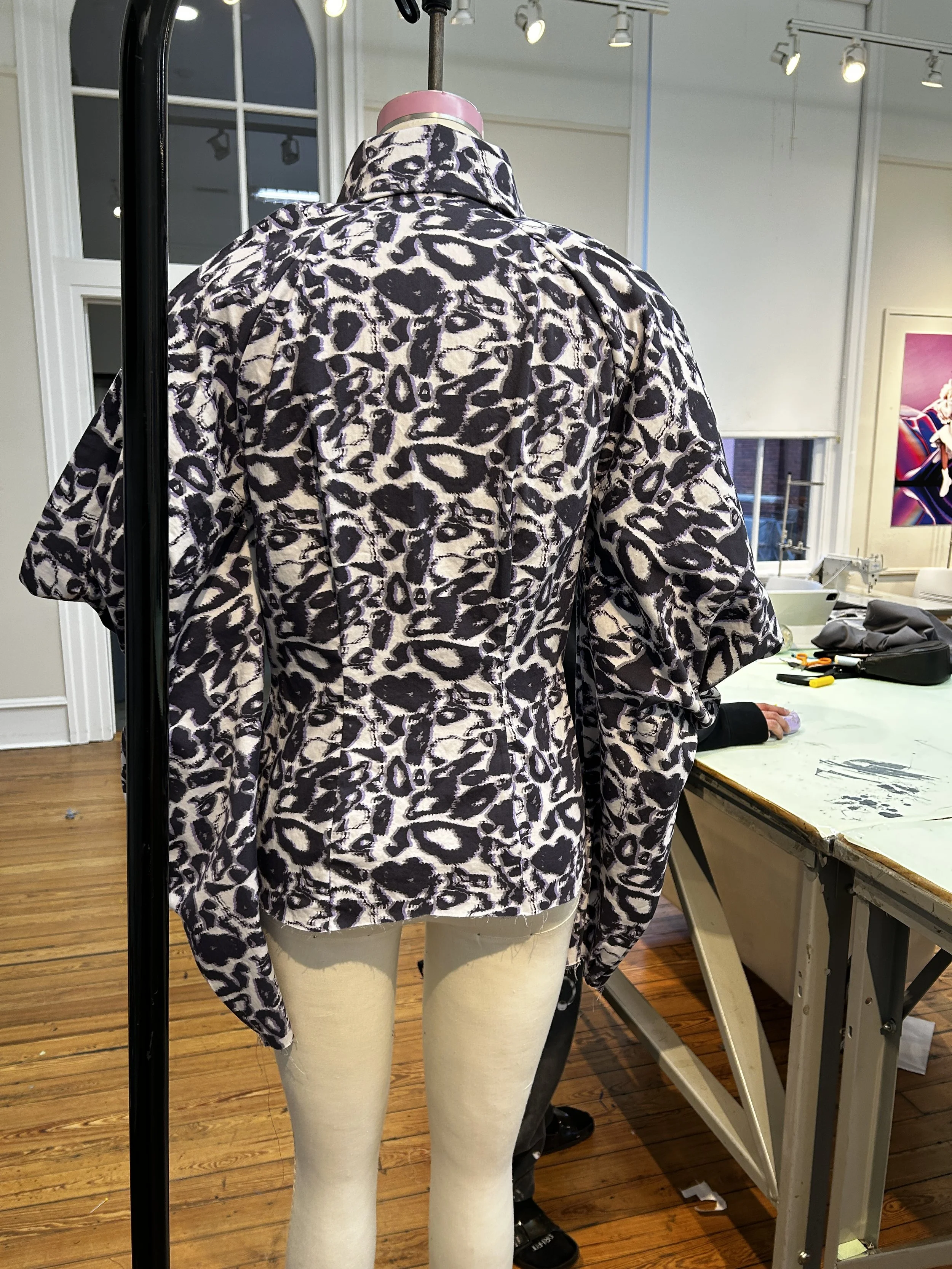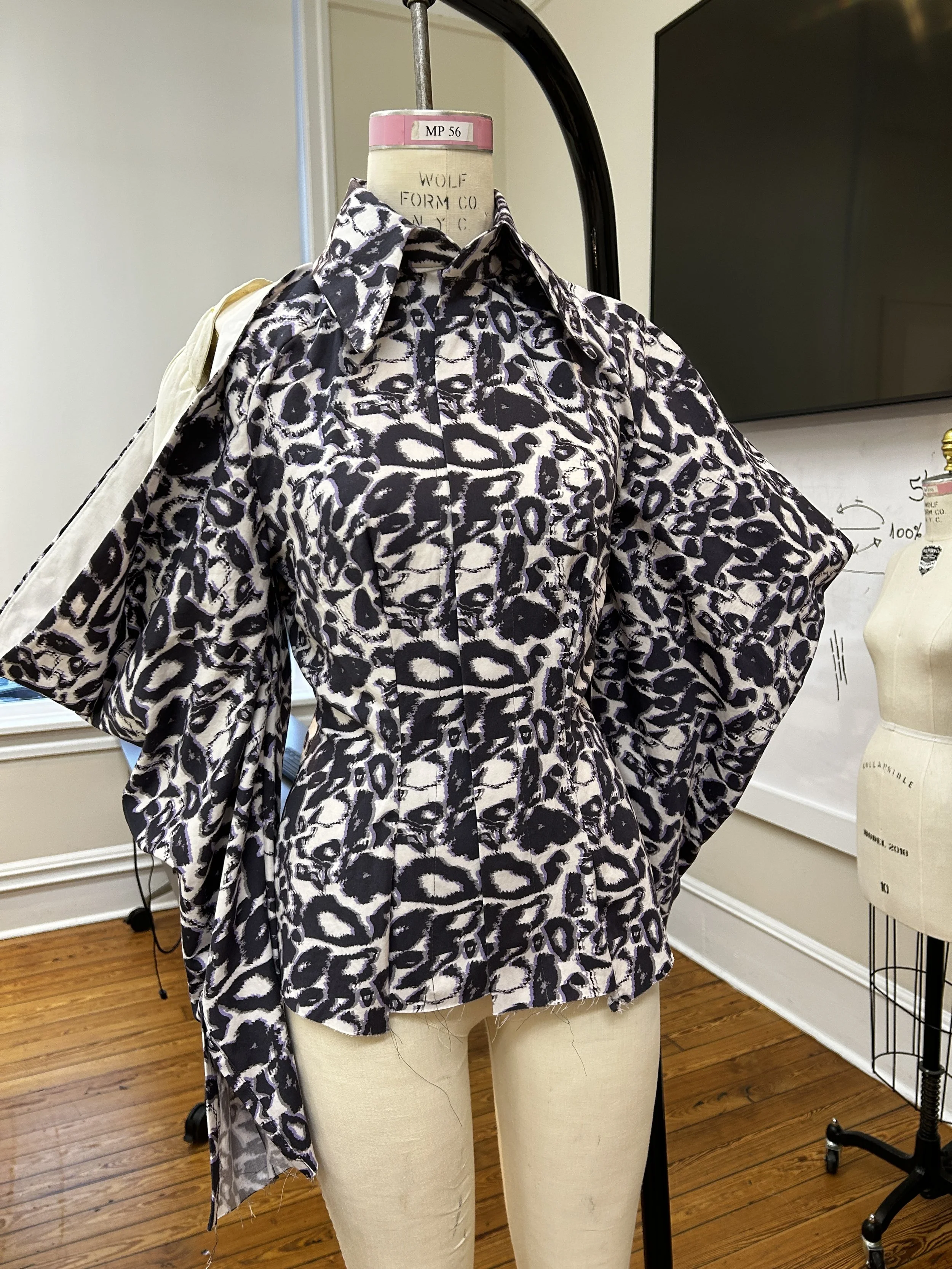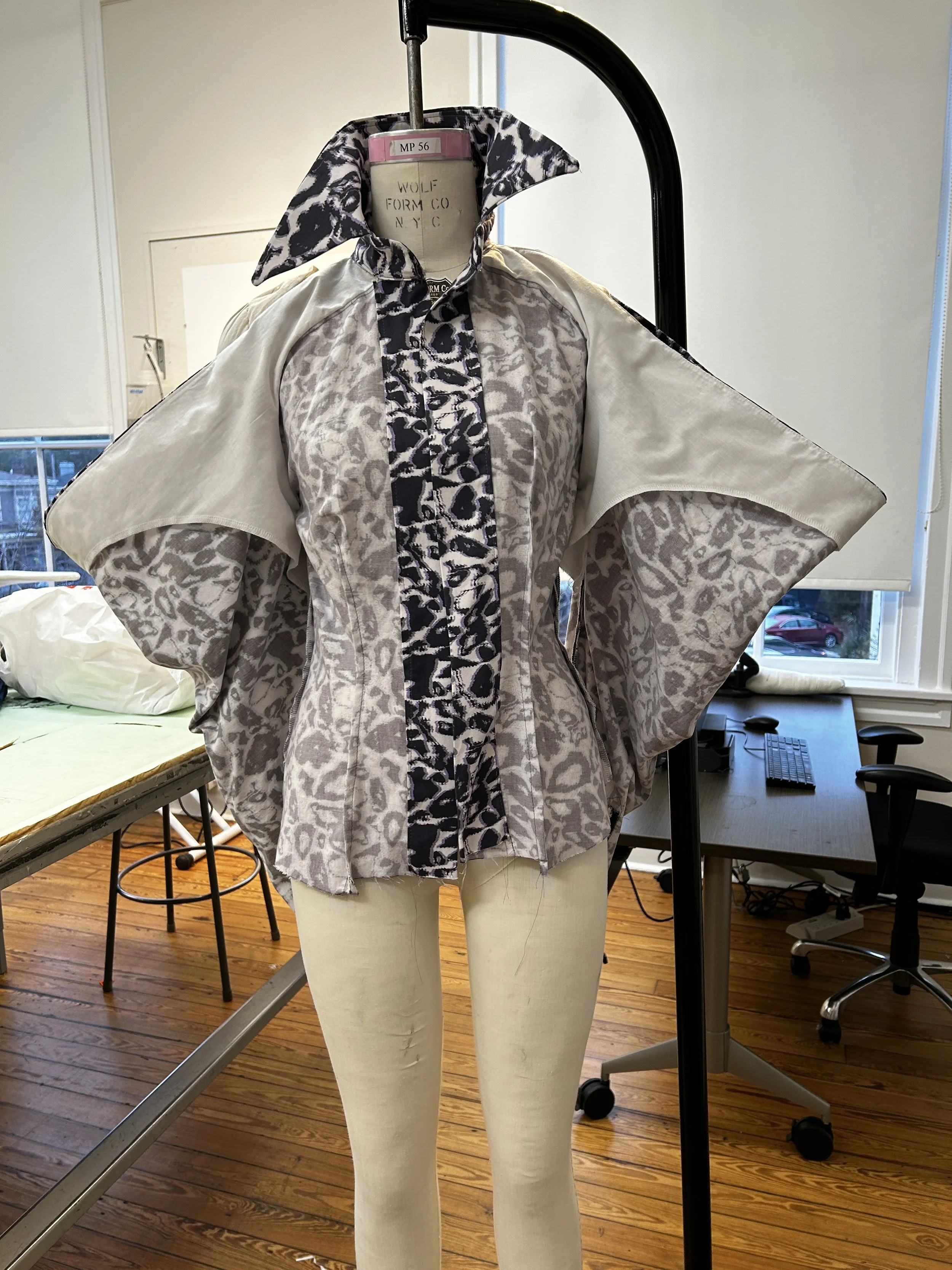 I used SCAD's on-site fabric printing to bring my repeat design to life on cotton fabric, incorporating it into the shirt for a fully customized final piece that captured both the essence of the original Alexander McQueen design and my personal creative touch.