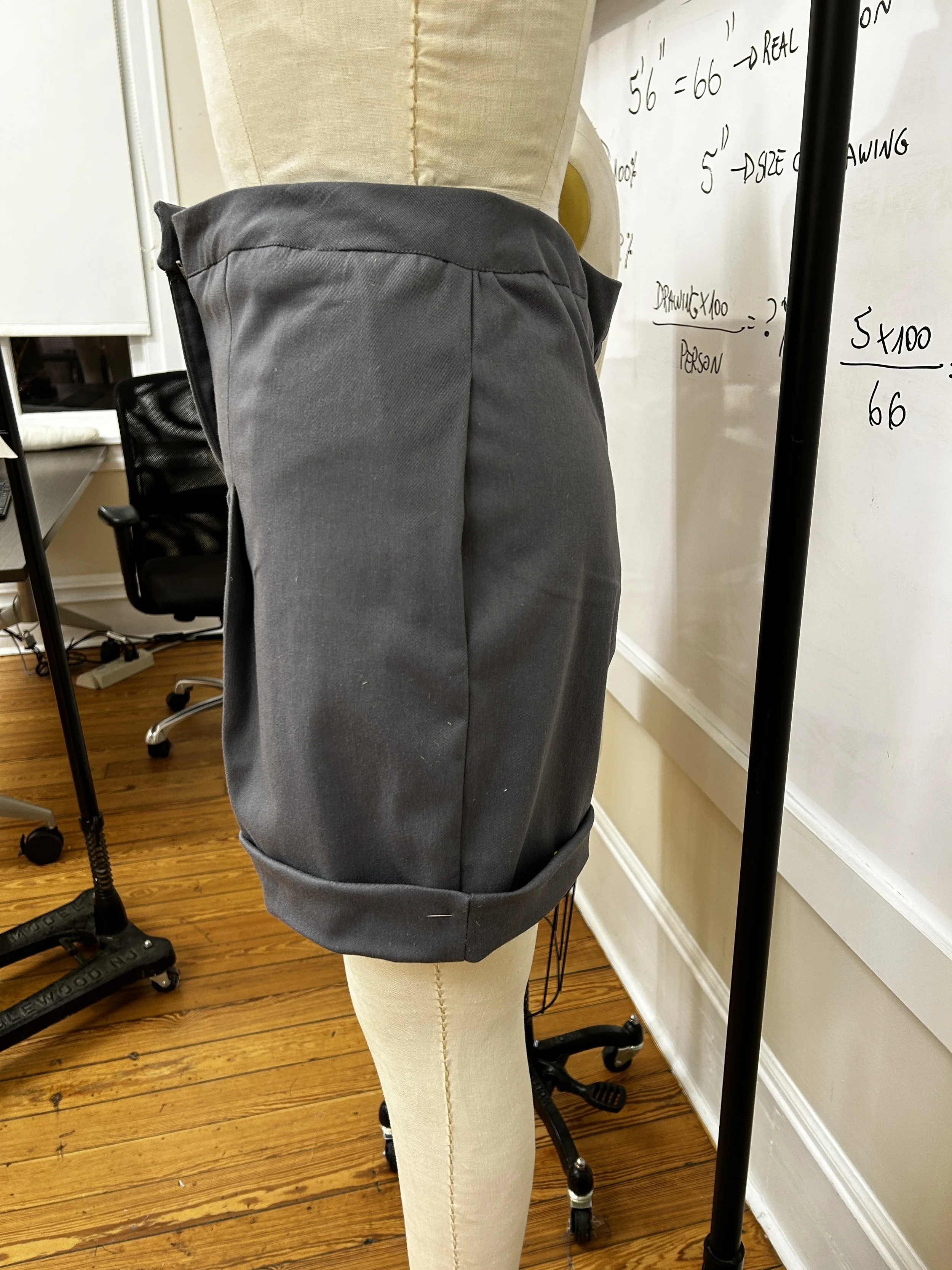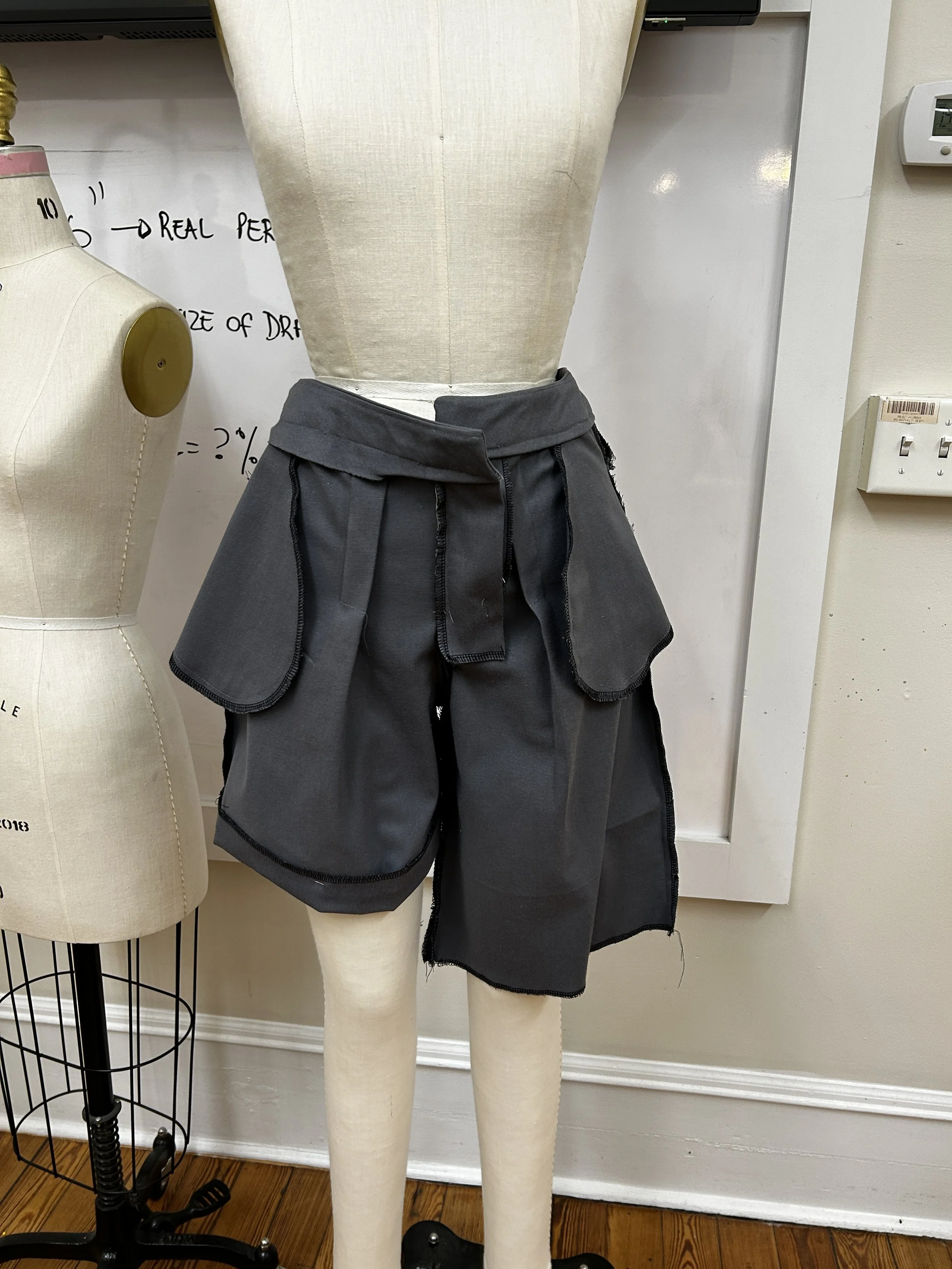 For our final project in Fashion Pattern Development, we were challenged to recreate two designer garments using only a reference image from a website. I was assigned an Alexander McQueen button-down blouse with dramatic wide cold shoulders and a pair of tailored shorts featuring both front and back pleats, tasked with accurately drafting patterns to capture every detail and silhouette.